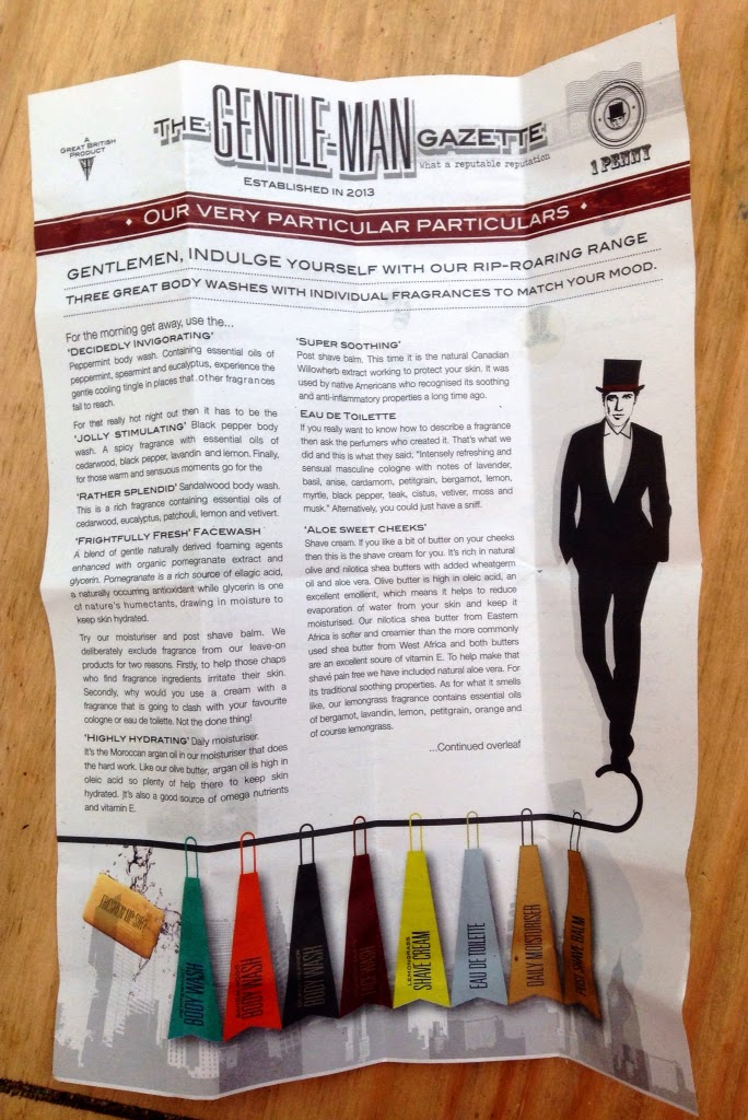 All of the products come with outer boxes which display half a mans face with a top hat. My boyfriend isn't one to keep boxes or display products but if he were, these look lovely on a shelf together and can be turned around so that the faces match up - a nice little touch. Inside each of the boxes there is a paper insert which is made like a newspaper and called The Gentle-Man Gazette. This contains product information plus a few wee quirky quotes etc. I love this and think a consumer would be far more likely to read this than a boring ingredients list shoved into the box.